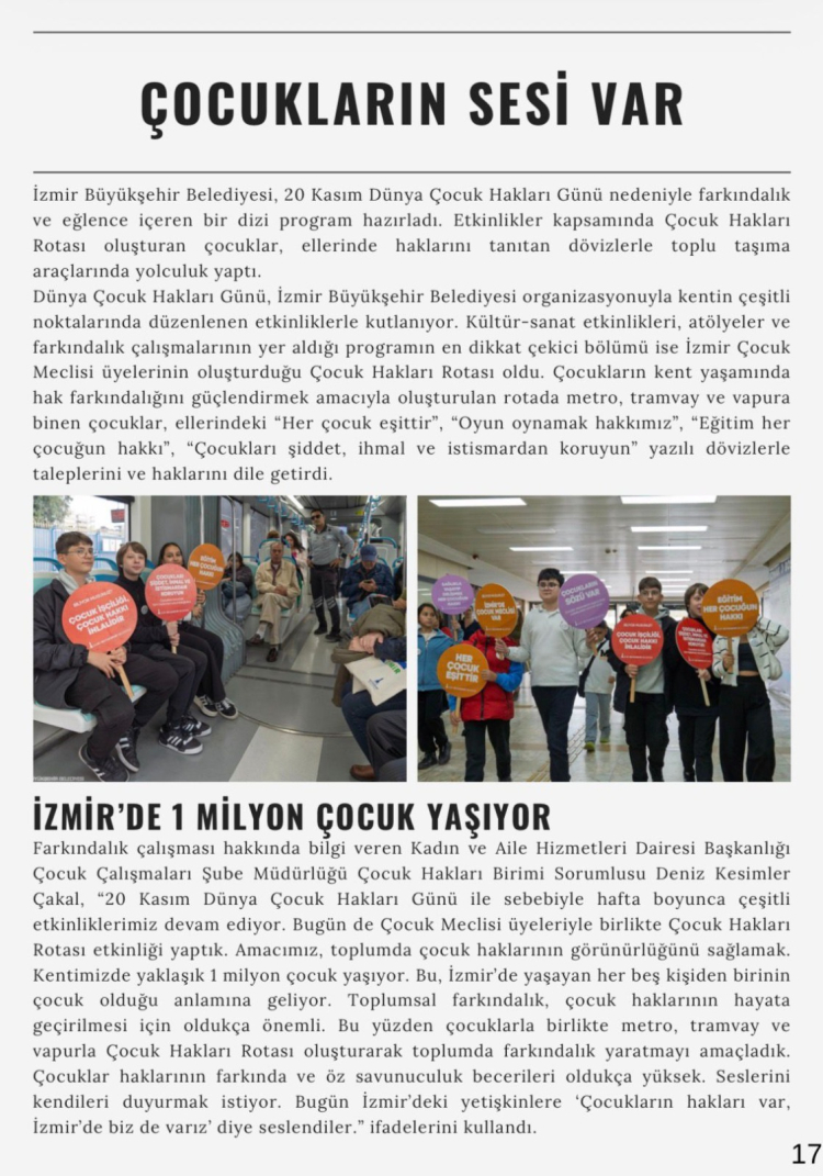 Aylık yayımlanan bülten, İzmir’deki her bireyin hizmetlere kolayca ulaşabilmesini sağlamayı amaçlıyor. Kasım sayısında, 25 Kasım Kadına Yönelik Şiddete Karşı Uluslararası Mücadele Günü kapsamında kent genelinde yapılan etkinliklerden 20 Kasım Dünya Çocuk Hakları Günü çalışmalarına; istihdam odaklı eğitimlerden üniversite öğrencilerine yönelik dil kulübü çalışmalarına kadar birçok faaliyete ilişkin haber yer alıyor. Bülten, bu hizmetlere ilişkin farkındalığı ve katılımı artırmayı hedefliyor.