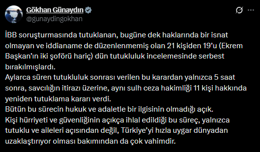 Günaydın, sosyal medya hesabından yaptığı açıklamada, tutuklanan kişilerin bugüne dek haklarında bir isnat olmayan ve iddianame de düzenlenmemiş olan 21 kişiden 19’unun (Ekrem İmamoğlu’nun iki şoförü hariç) dün tutukluluk incelemesinde serbest bırakıldığını belirtti.