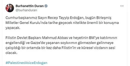 İletişim Başkanı Burhanettin Duran, sosyal medya hesabından yaptığı açıklamada, “Cumhurbaşkanımız Sayın Recep Tayyip Erdoğan, bugün Birleşmiş Milletler Genel Kurulu’nda tarihe geçecek nitelikte önemli bir konuşma yapacak. Filistin Devlet Başkanı Mahmud Abbas ve heyetinin BM’ye katılımının engellendiği ve Gazze’de yaşanan soykırımın görmezden gelinmeye çalışıldığı bir ortamda bir kez daha Filistin’in ve küresel vicdanın sesi olacak” ifadelerini kullandı.