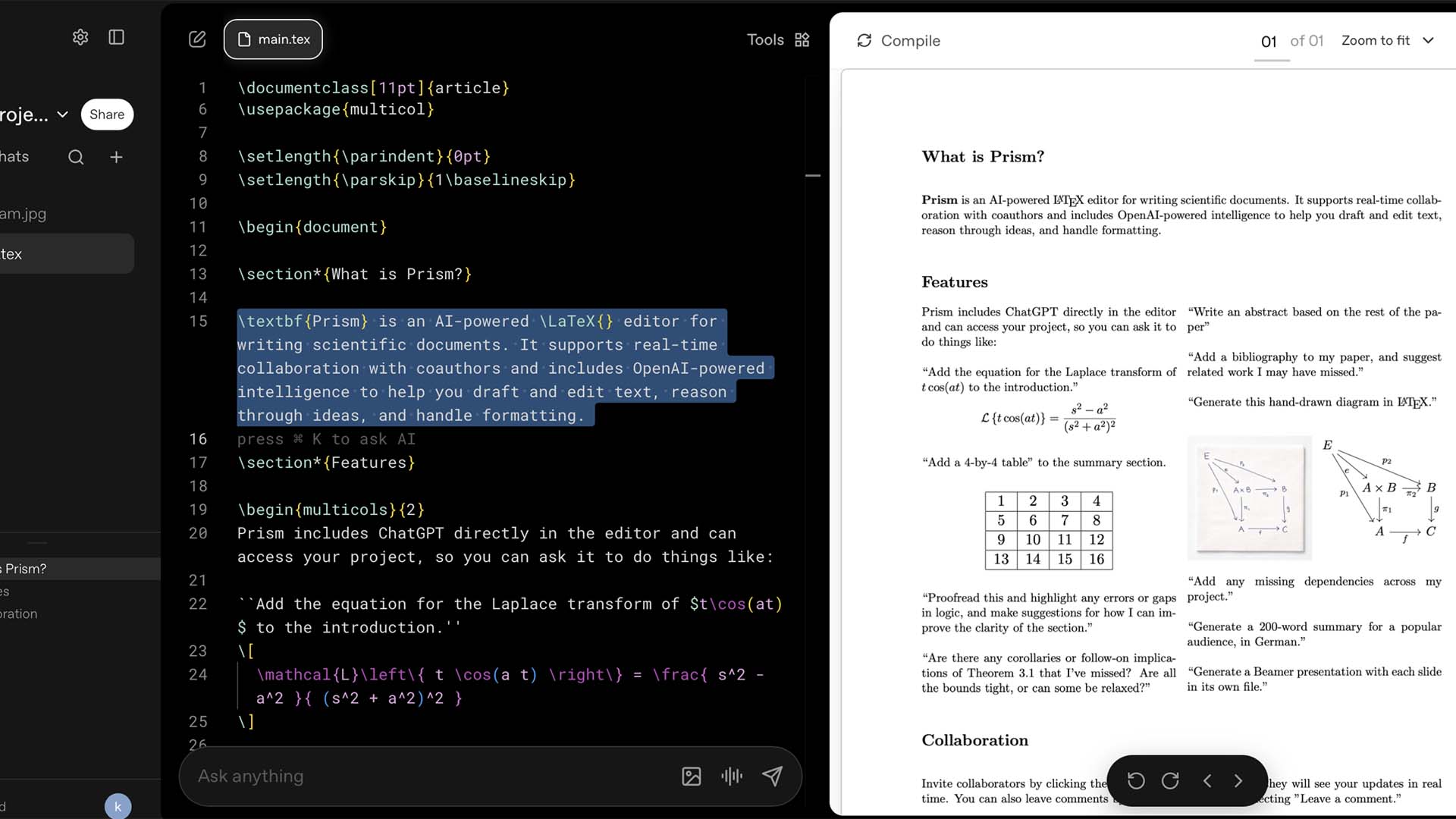OpenAI, Prism hakkında şunları söylüyor: “Prism, bilimsel makaleler için geliştirilmiş yapay zeka destekli bir editördür. Diğer yazarlarla ve bilim insanlarıyla aynı anda çalışmanıza olanak tanırken; metin yazma, fikirlerinizi geliştirme ve formatlama işlemlerinde yapay zeka destekli akıllı özellikleriyle size yardımcı olarak zaman kazandırır. Prism, doğrudan LaTeX temelli tek bir çalışma ortamında sınırsız proje geliştirmenize ve istediğiniz kadar kişiyle birlikte çalışmanıza olanak sağlar.”