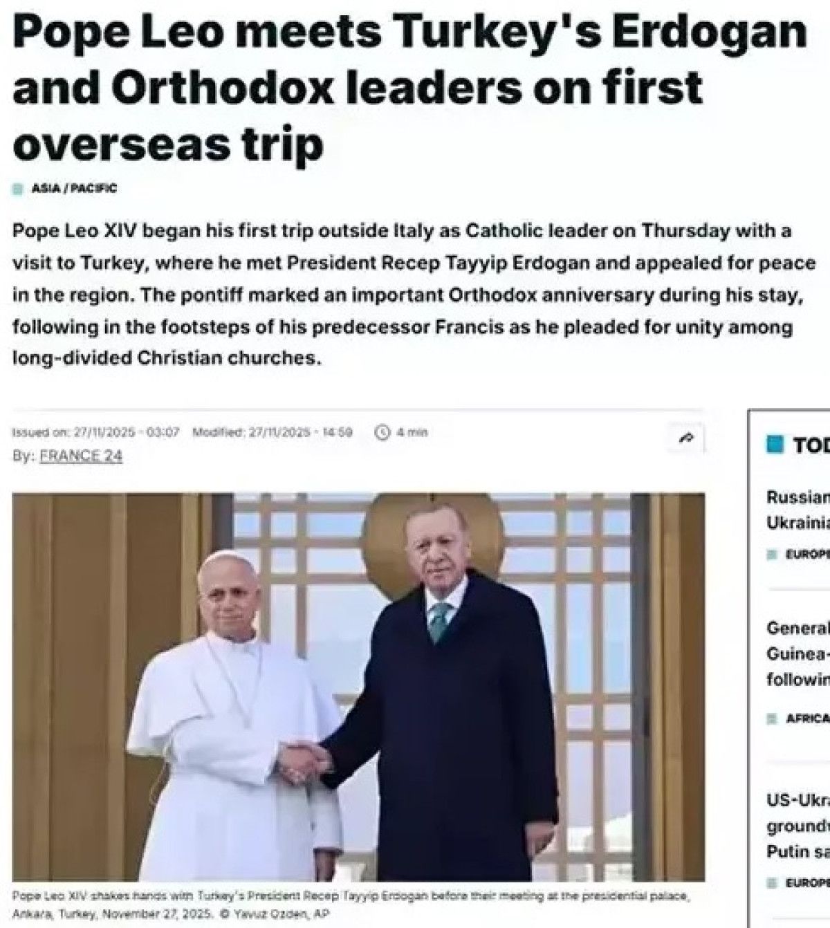 İlk yurt dışı ziyaretini Türkiye’ye yapan Papa 14. Leo’nun Cumhurbaşkanı Recep Tayyip Erdoğan’la görüşmesinin ardından yaptığı açıklamada Erdoğan’a ‘istikrar kaynağı’ olarak rol üstlenmesi çağrısında bulunması dünya basınında gündeme oturdu.